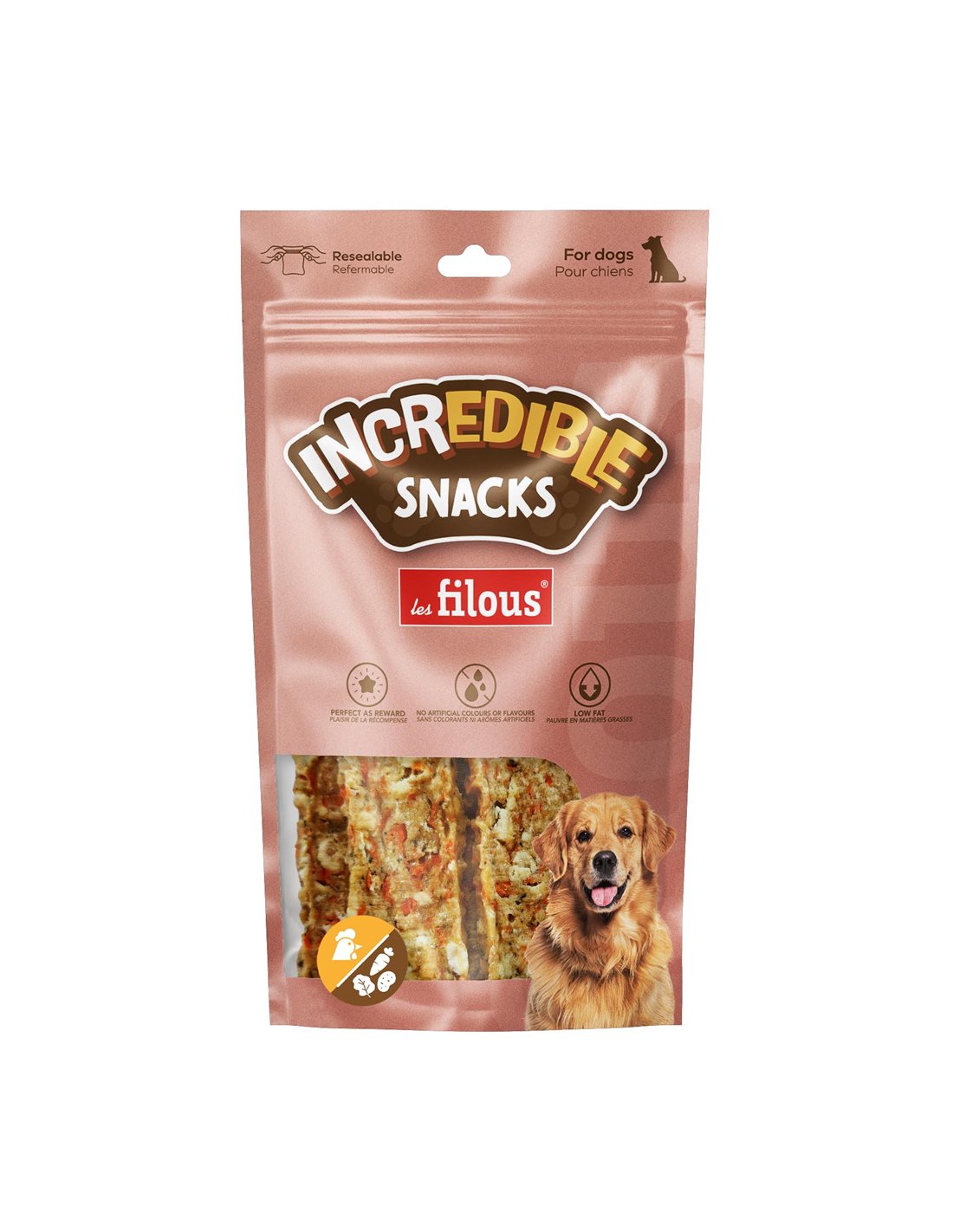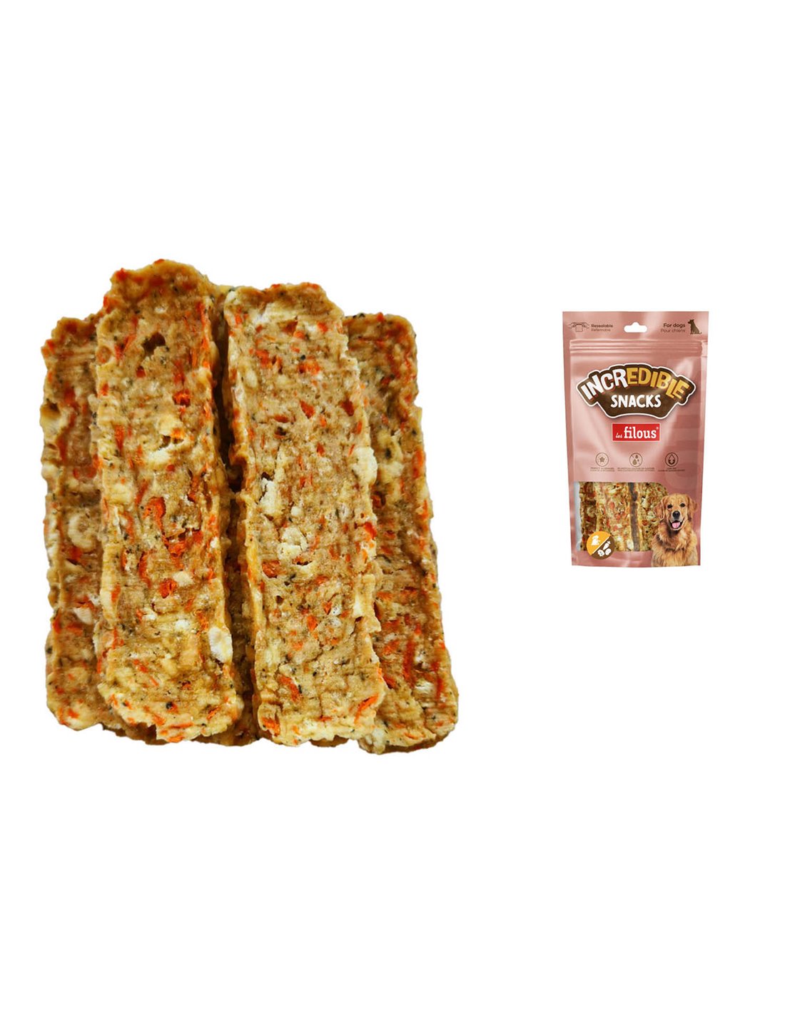 POLLO 70%, PATATE, AMIDO DI TAPIOCA, CAROTA, FARINA DI FRUMENTO, PROTEINE VEGETALI, SPINACI. ADDITIVI: GLICERINA VEGETALE, SORBITOLO, SALE, SORBATO DI POTASSIO.