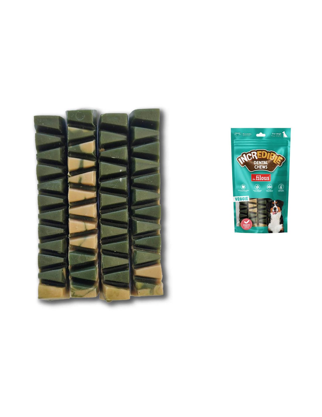 FARINA DI PATATA DOLCE, AMIDO DI PISELLI, BROCCOLI DISIDRATATI, LIEVITO DISIDRATATO, PREZZEMOLO DISIDRATATO, MENTA DISIDRATATA, ROSMARINO DISIDRATATO, ESTRATTO DI CAMOMILLA. ADDITIVI: GLICERINA VEGETALE, CARBONATO DI CALCIO, CELLULOSA IN POLVERE, SORBATO DI POTASSIO, PROTEASI.