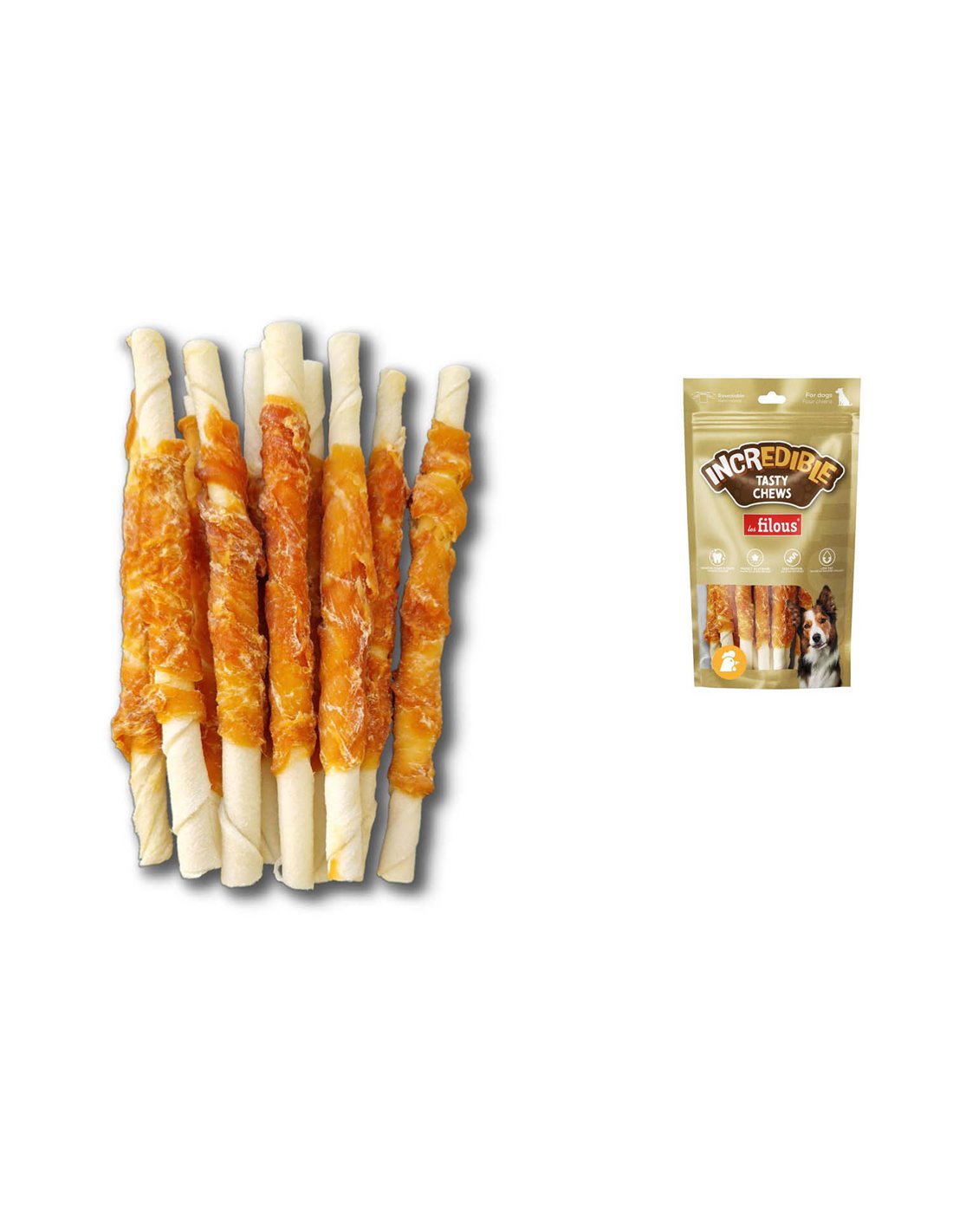 PELLE BOVINA 67.8%, POLLO 23.9%, AMIDO DI MAIS, PROTEINE VEGETALI. ADDITIVI: GLICEROLO, SORBITOLO, SODIO DIACETATO, SALE, SORBATO DI POTASSIO.