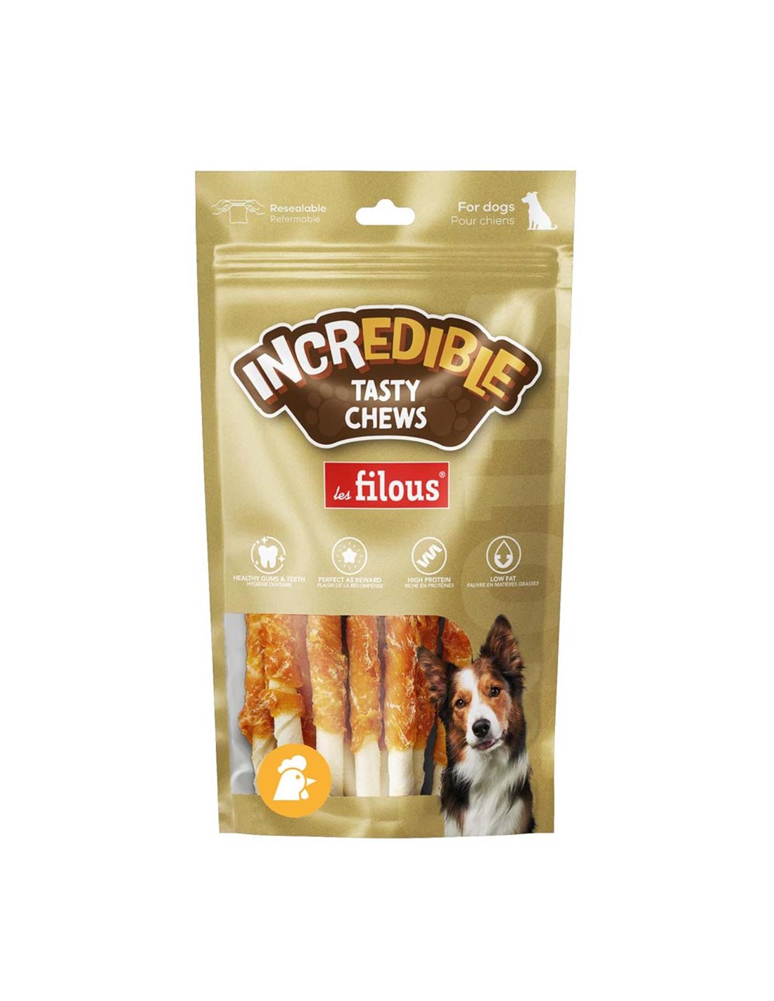 IDEALE COME SNACK E COME PREMIO. QUESTE CHIPS HANNO UNA SPECIALE CONSISTENZA POROSA E SPUGNOSA, CHE LE RENDE ALLO STESSO TEMPO SOLIDE E GOMMOSE. IN TRE DIFFERENTI COLORI, SONO STUDIATE PER INCREMENTARE LA FRIZIONE SUI DENTI DURANTE LA MASTICAZIONE. AIUTANO A RIDURRE GLI ACCUMULI DI TARTARO E CONTRIBUISCONO A PRESERVARE L'IGIENE DENTALE DEL CANE.