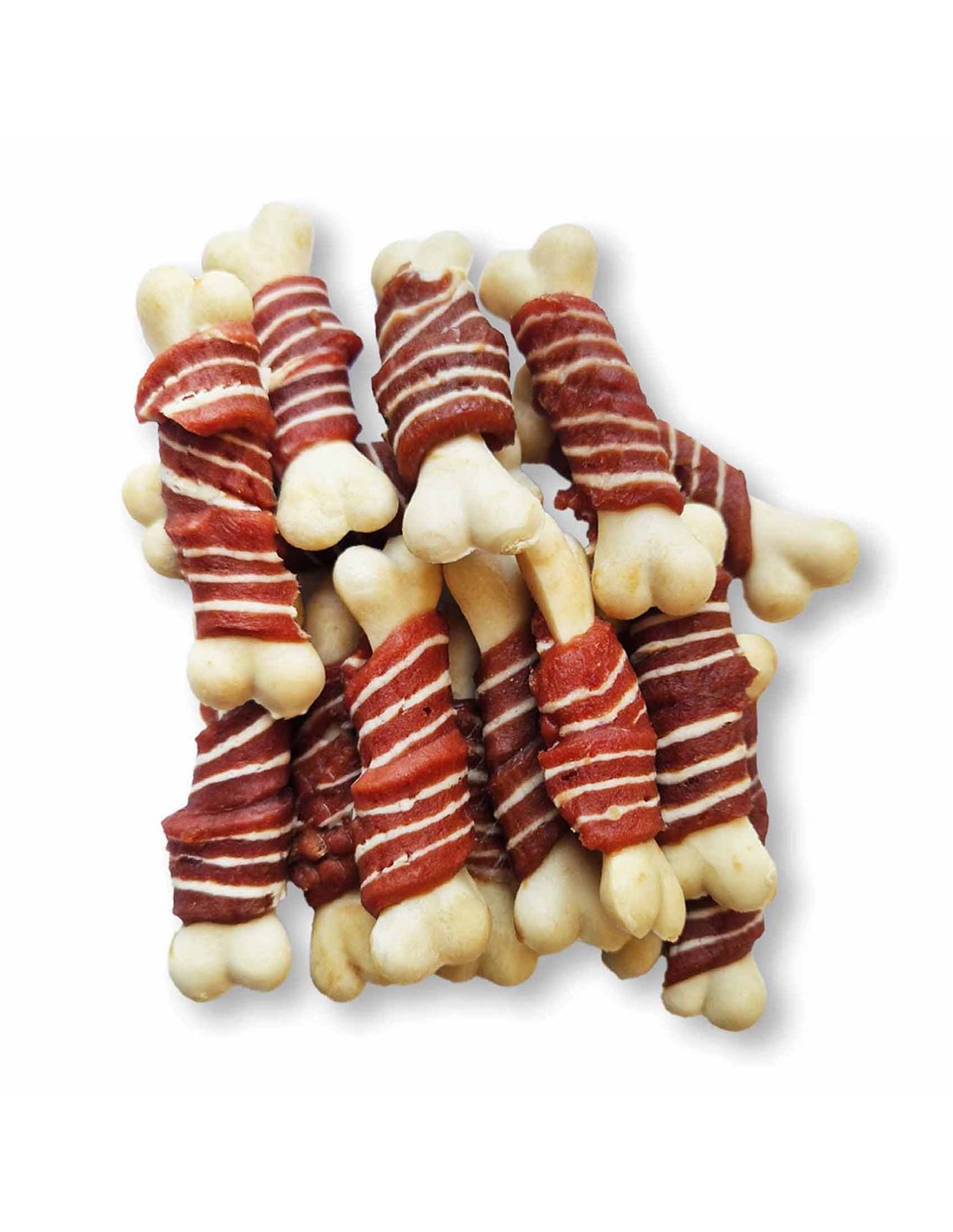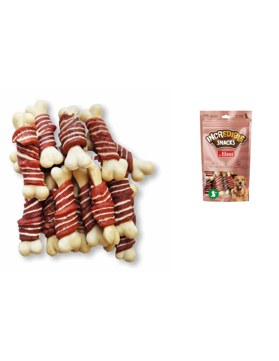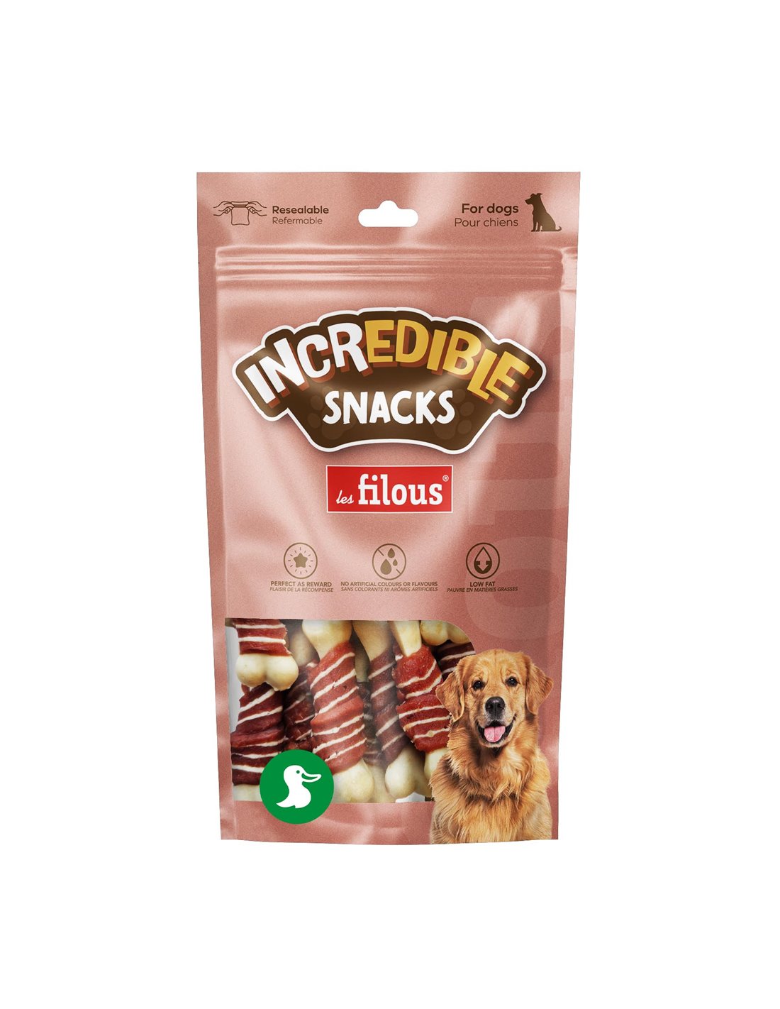 ANATRA 38%, AMIDO DI TAPIOCA, FARINA DI FRUMENTO, MERLUZZO 9%, PROTEINE VEGETALI. ADDITIVI: GLICERINA VEGETALE, SORBITOLO, CARBONATO DI CALCIO, SALE, SORBATO DI POTASSIO.